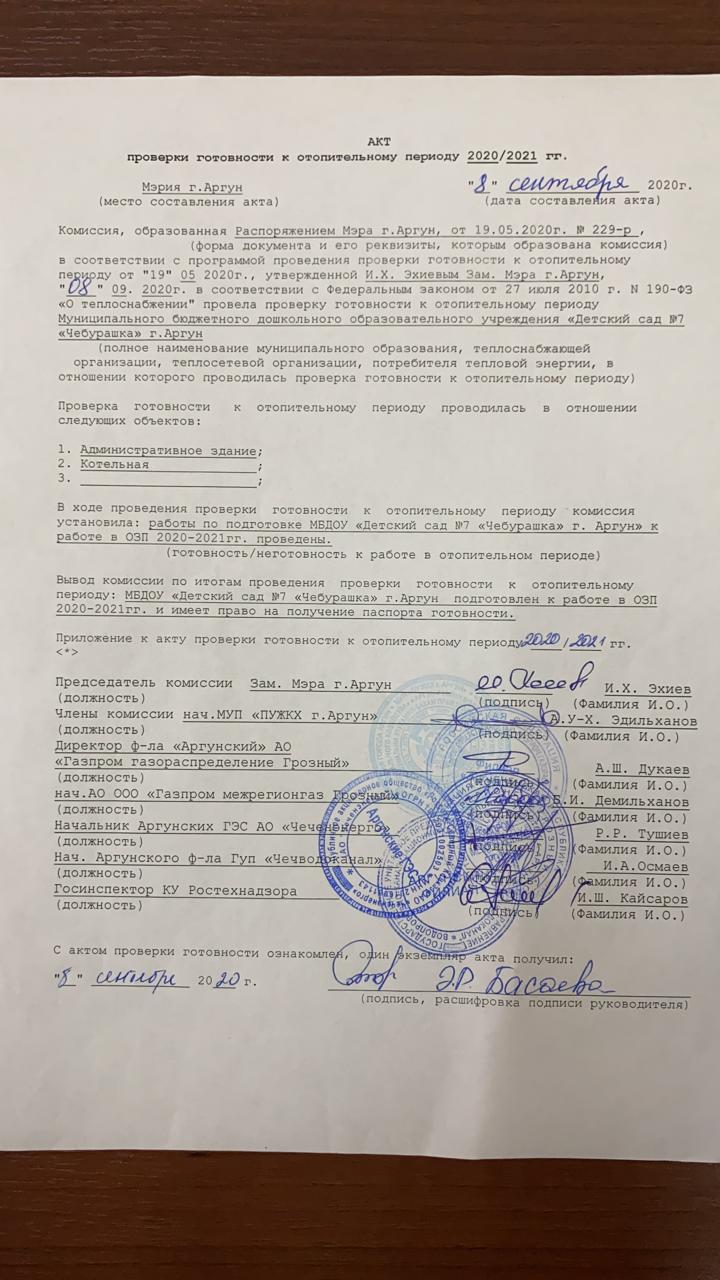 Акт проверки готовности ДОУ к отопительному сезону Чебурашка