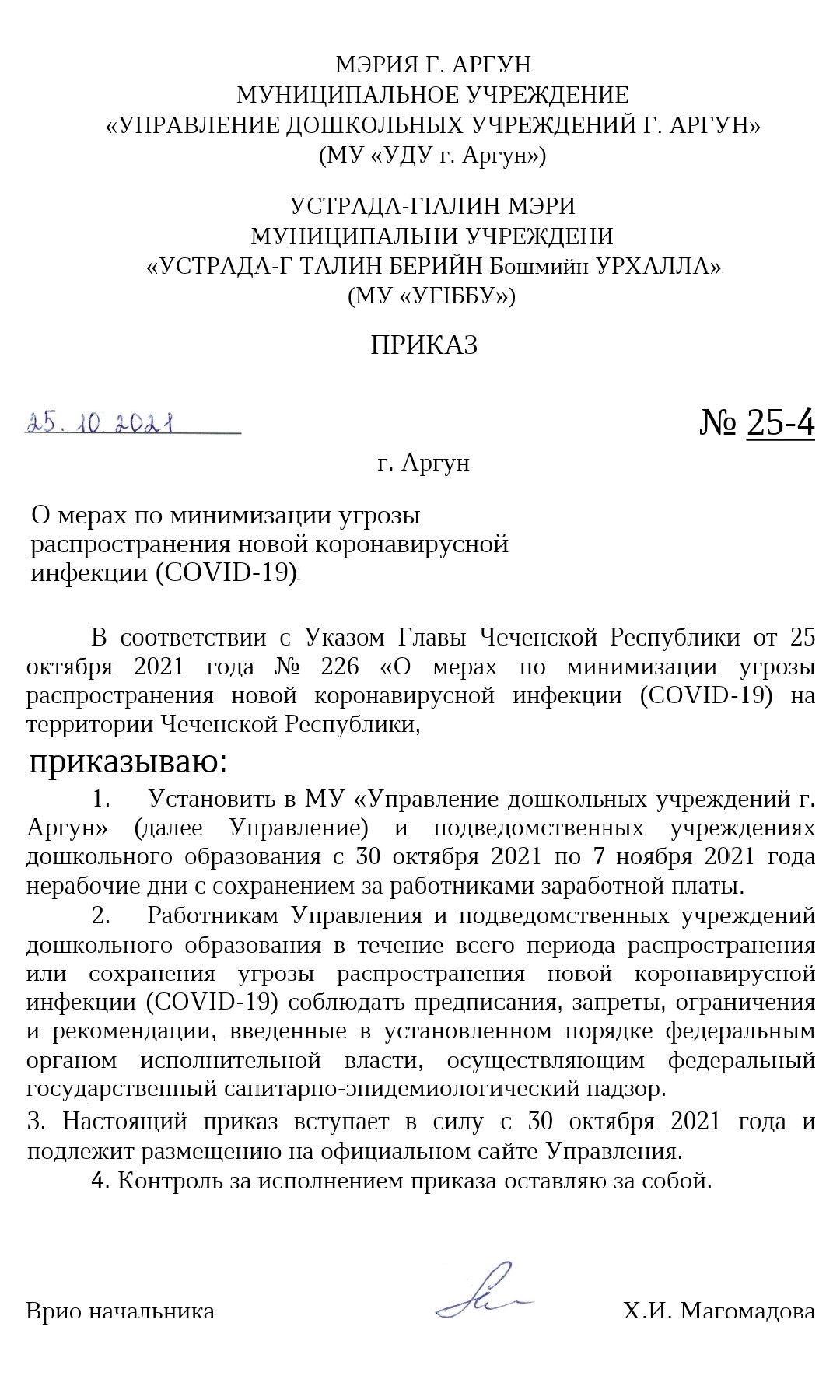 26.10.2021В соответствии со статьей 6 Федерального закона от 30 марта 1999 года № 52-ФЗ "О санитарно-эпидемиологическом благополучии населения", в целях реализации на территории Чеченской Республики Указа Президента Российской Федерации от 20 октября 2021 года № 595 "Об установлении на территории Российской Федерации нерабочих дней в октябре-ноябре 2021 года" постановляю: