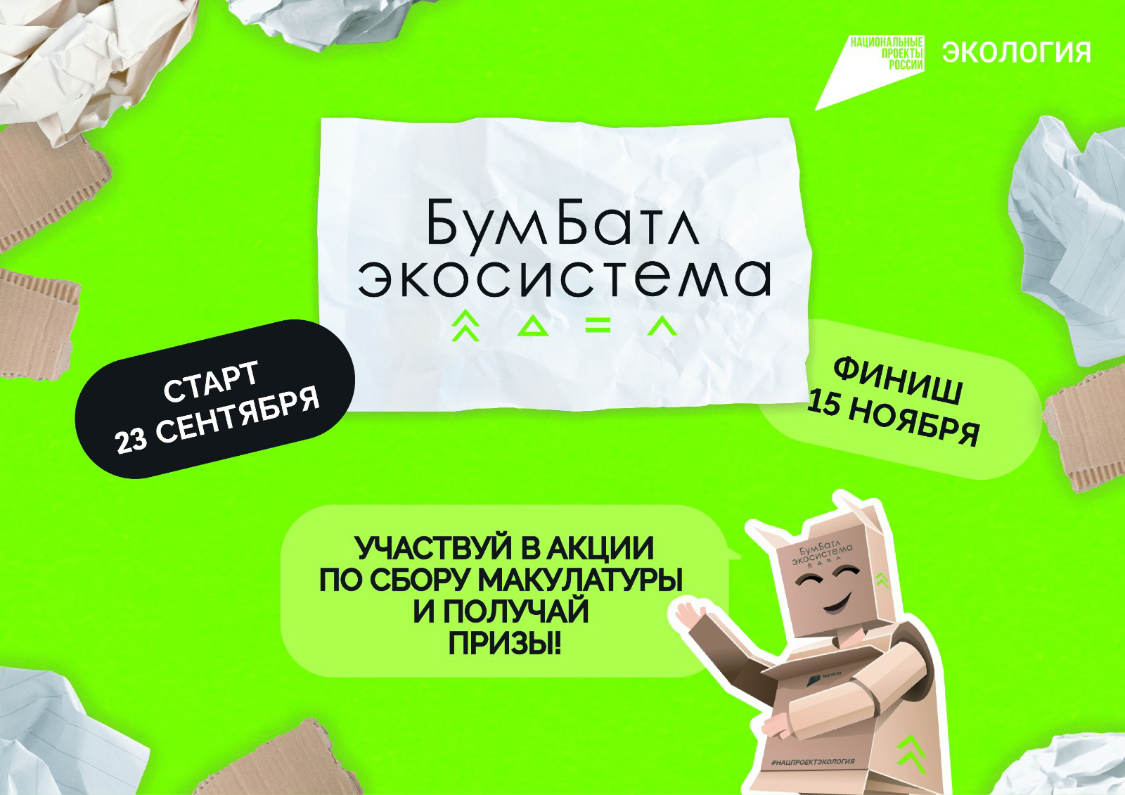 Юбилейный сезон акции «БумБатл» стартовал 23 сентября. В этом году масштабный экологический проект вновь проходит под эгидой Всероссийского экологического общественного движения «Экосистема» в поддержку нацпроекта «Экология». Ключевая цель акции – сокращение излишнего потребления бумаги и формирование культуры обращения с отходами.